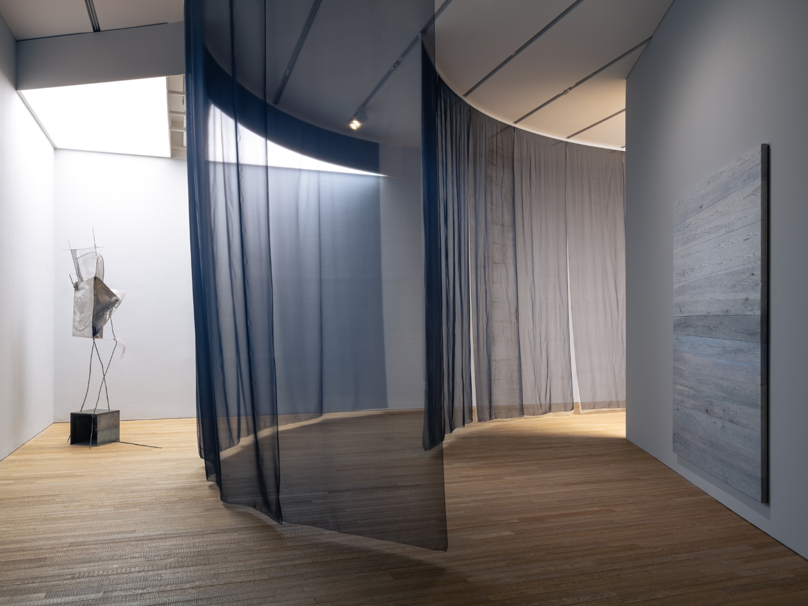 In Veering, artist Hu Xiaoyuan presents seven newly commissioned works, weaving together installation, sound, painting, and video to reveal the complex relationship between human destiny and natural evolution. Hu incorporates everyday materials like aerospace-grade aluminium, sea shells, organza silk, and corn fibre in her works. Through translucent drapes and lighting design, she creates unique pathways that blur the line between day and night. This setting guides visitors to reflect on enduring themes such as time, materiality, existence, and consciousness.