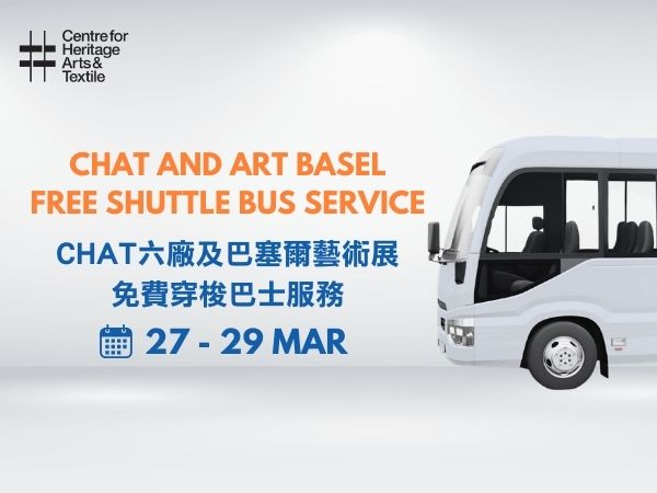 A complimentary shuttle bus service will operate between CHAT (The Mills) and Art Basel (Harbour Road Entrance of Hong Kong Convention and Exhibition Centre) from 11:00am to 6:00pm, 27 to 29 March, with departures every 60 minutes.