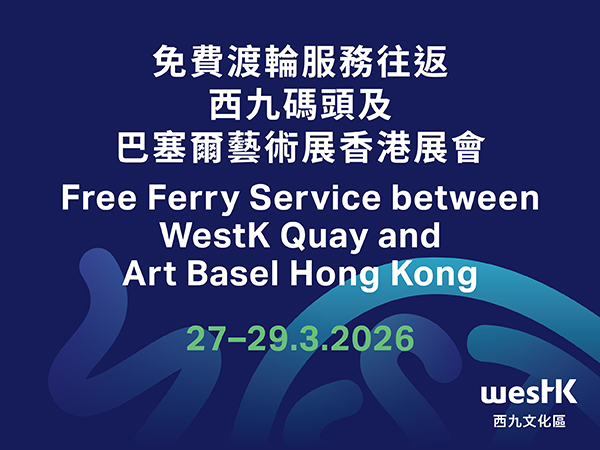 From 27 to 29 March 2026, a Free Ferry service will operate as a special route between WestK Quay and Art Basel Hong Kong (Golden Bauhinia Square, Wan Chai), with a journey time of approximately 20 minutes. The service is available to valid ticketholders of Art Basel Hong Kong 2026 or relevant tickets or credentials^ from WestK events (27–29 March). Departures are scheduled every 40 minutes to one hour from each side, operating from 11:30am to 5:45pm, with the last departure from Wan Chai.